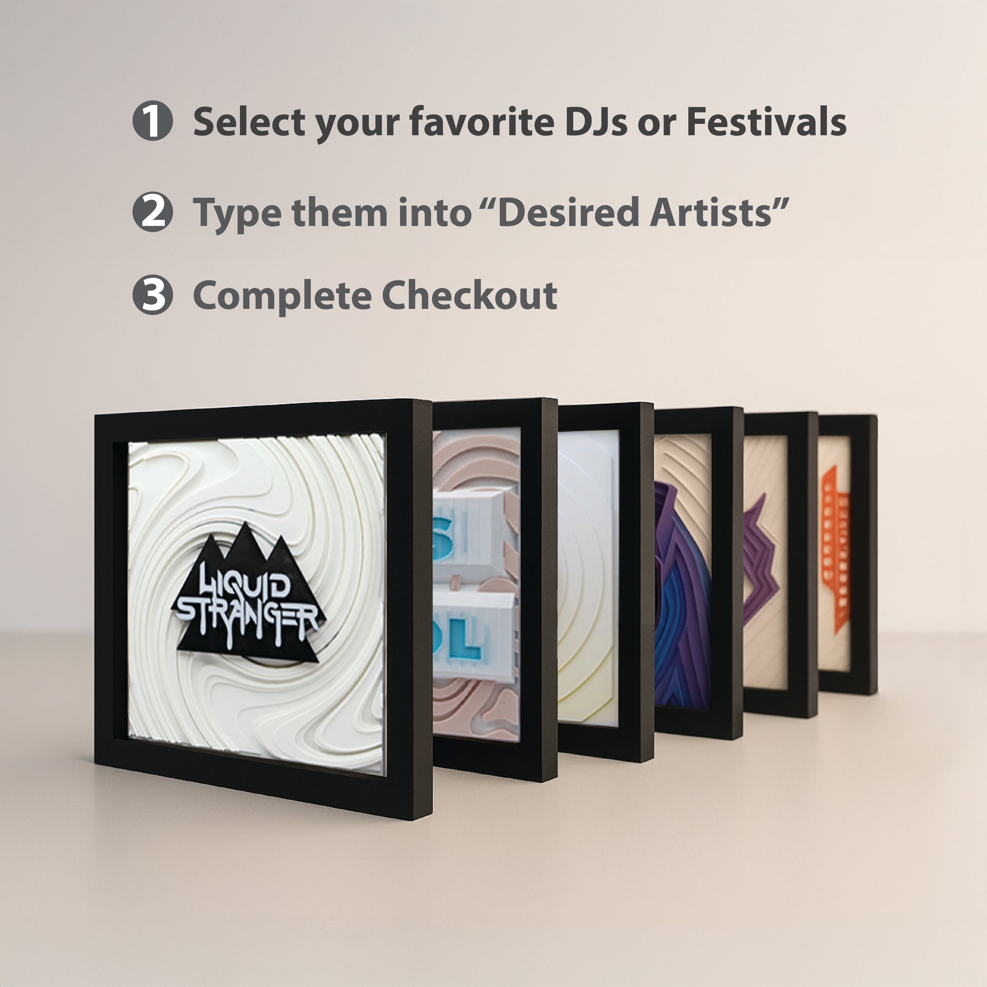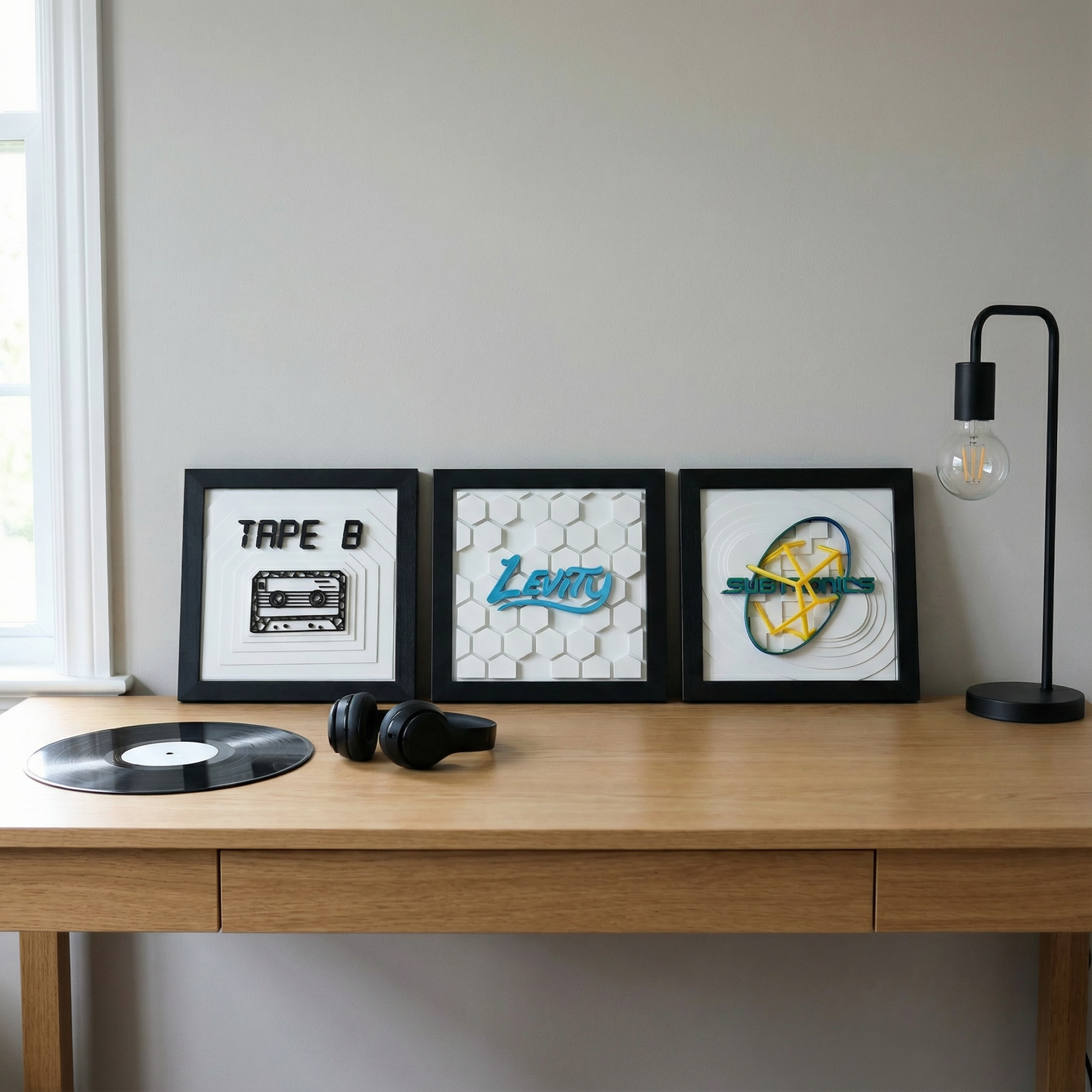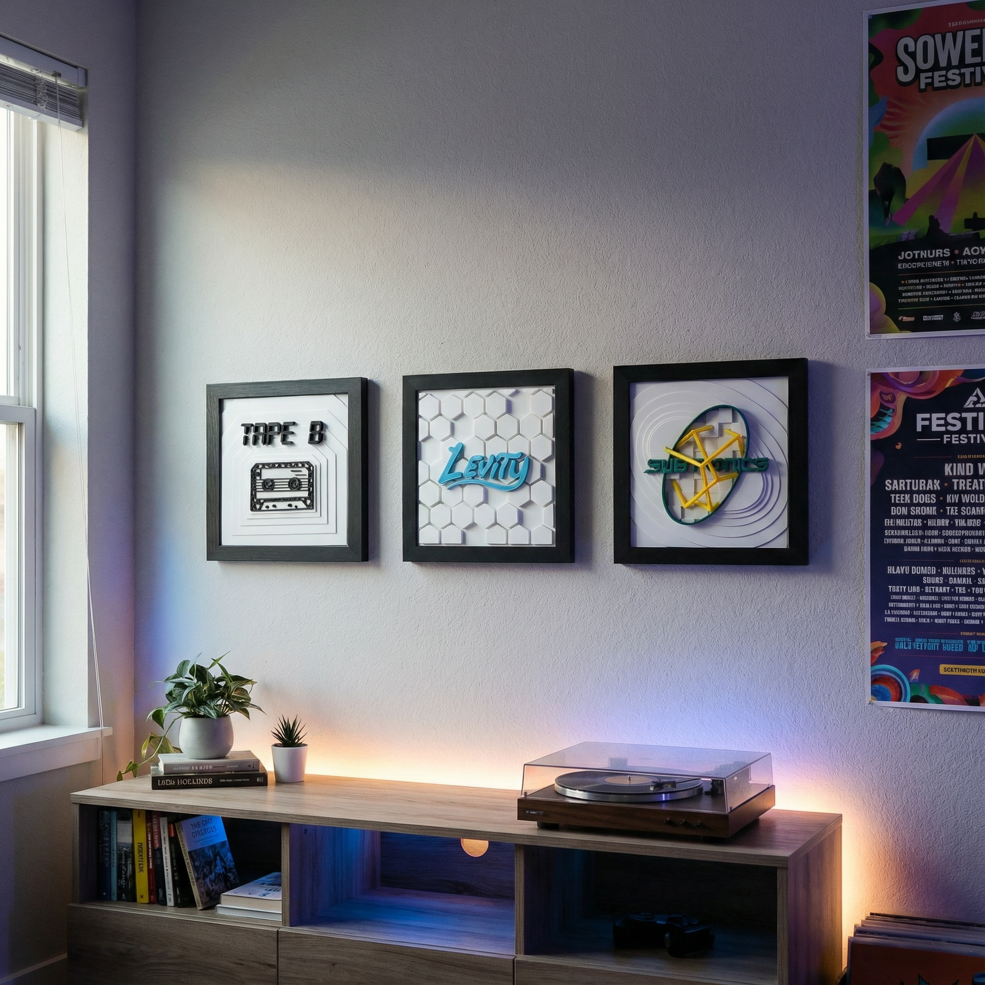 These 9"x9" square framed pieces are made perfectly to organize in a grid or row, all while keeping a minimal and elegant aesthetic. All of our pieces exhibit a harmonious blend of geometry, technology, and the pulsating beats of the best artists in the electronic dance music scene.