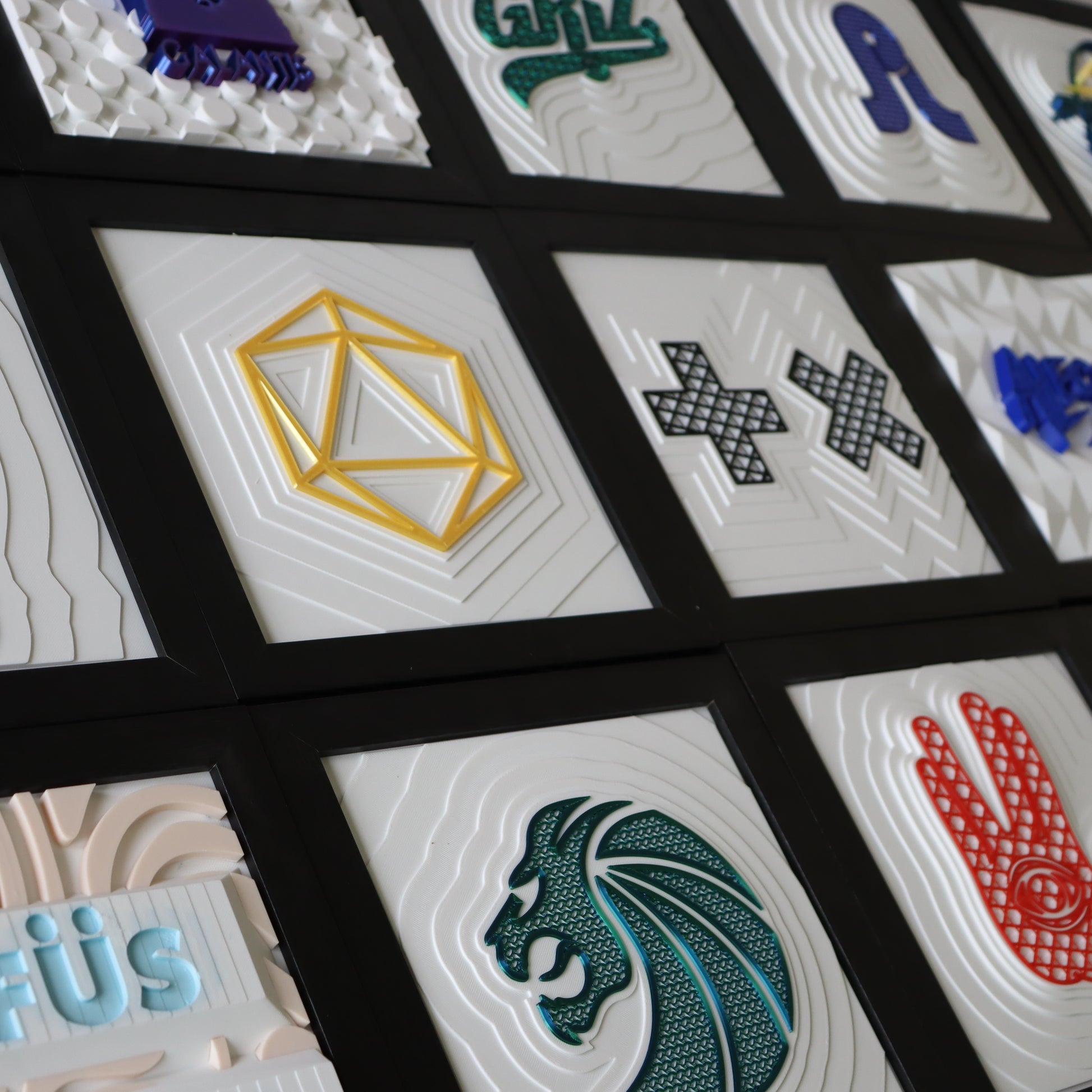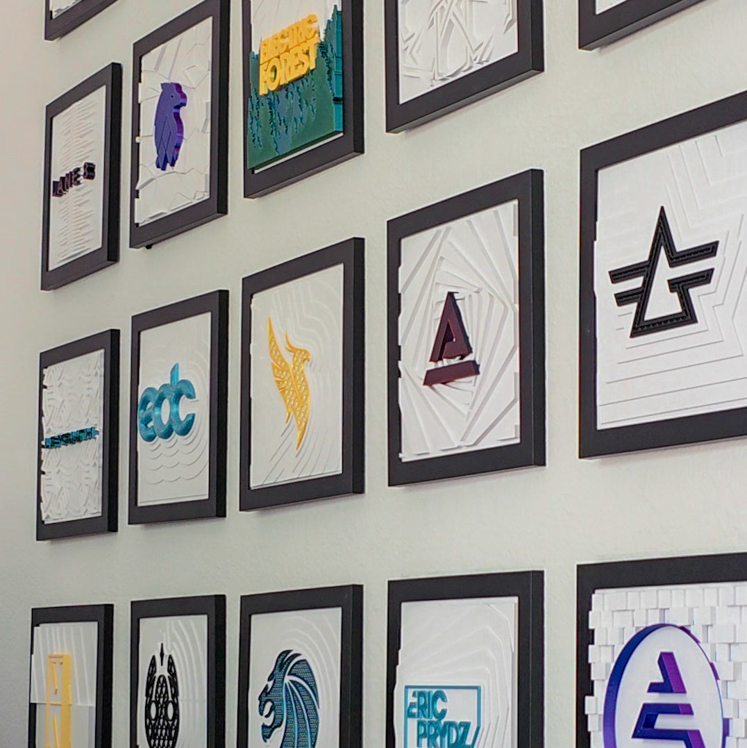 These 9"x9" square framed pieces are made perfectly to organize in a grid or row, all while keeping a minimal and elegant aesthetic. All of our pieces exhibit a harmonious blend of geometry, technology, and the pulsating beats of the best artists in the electronic dance music scene.