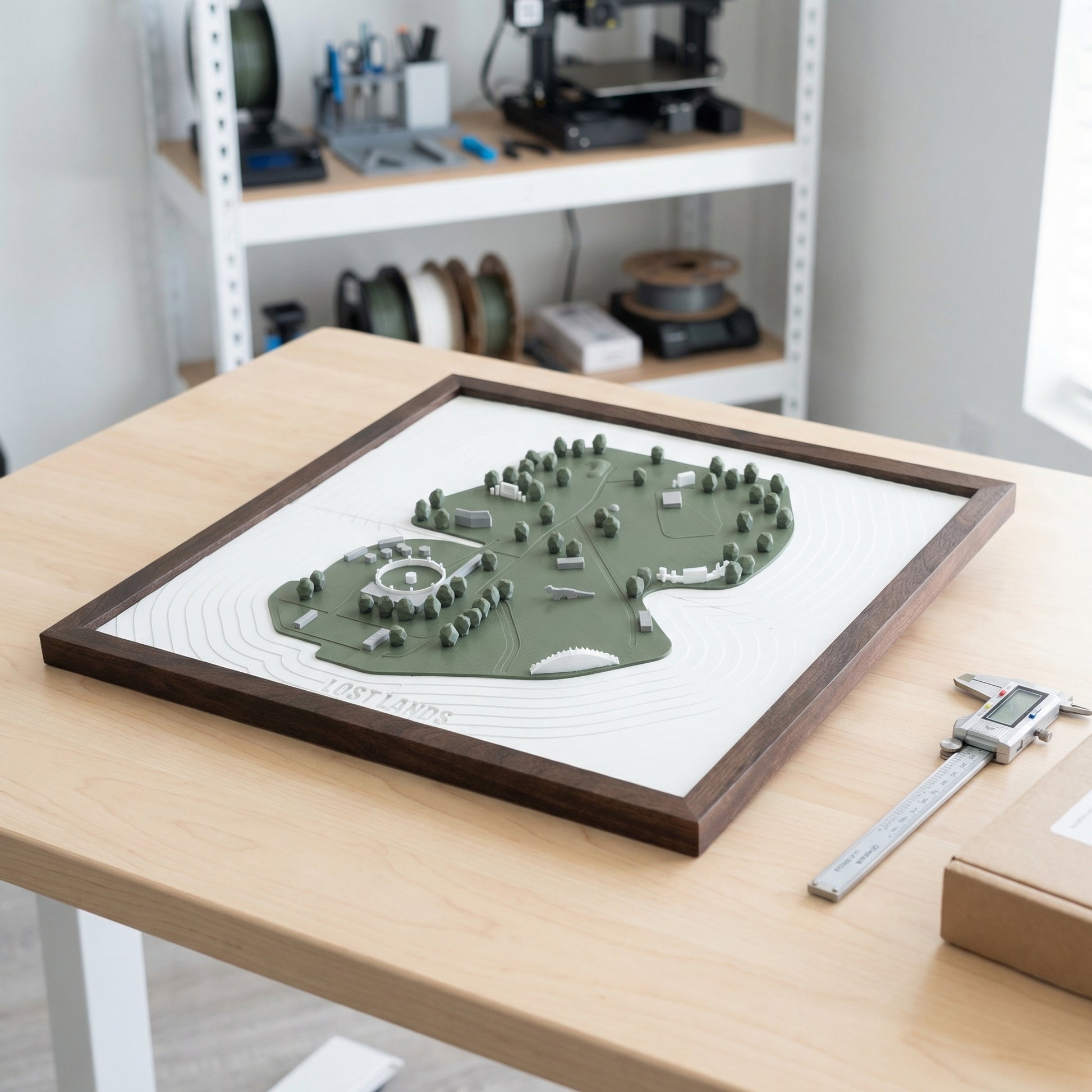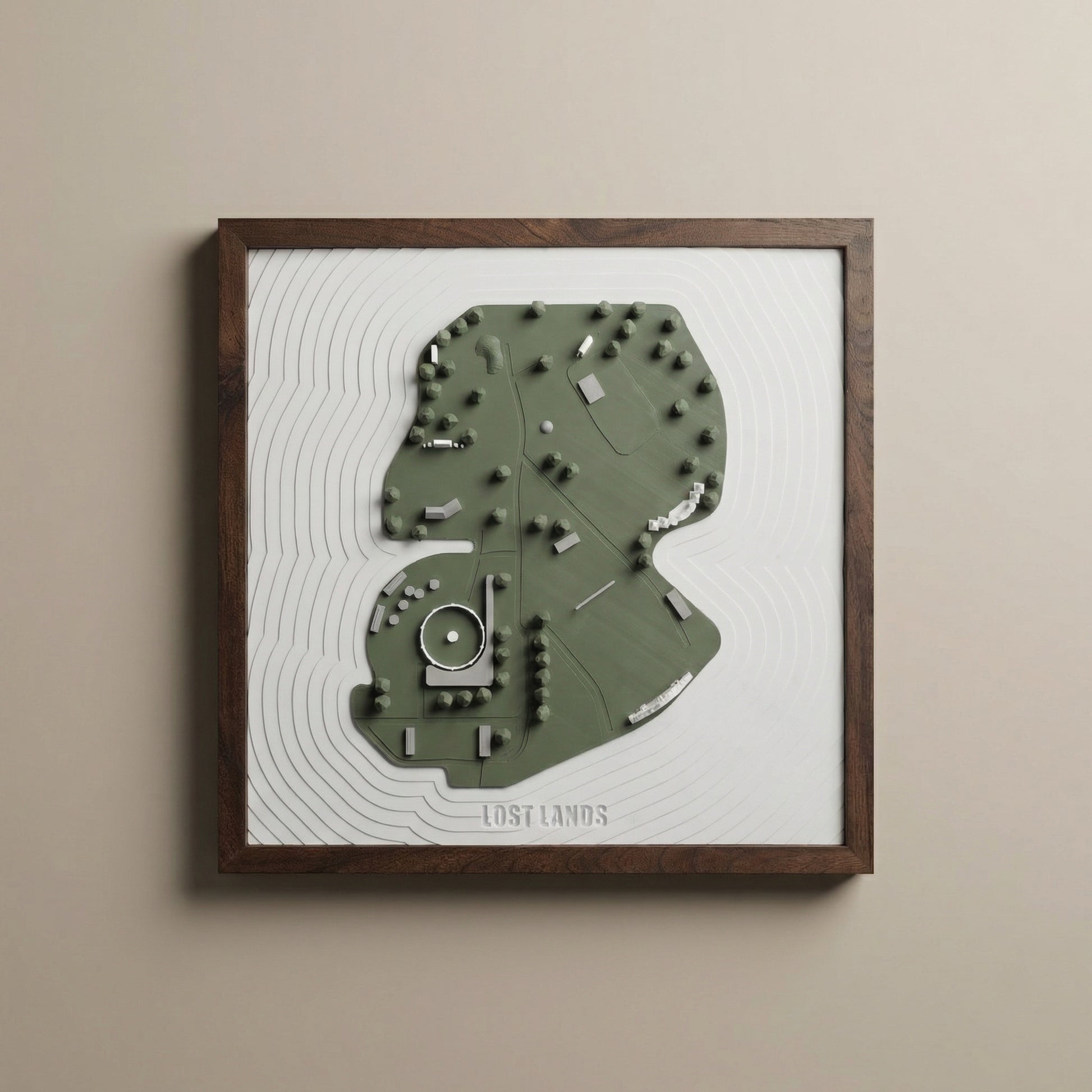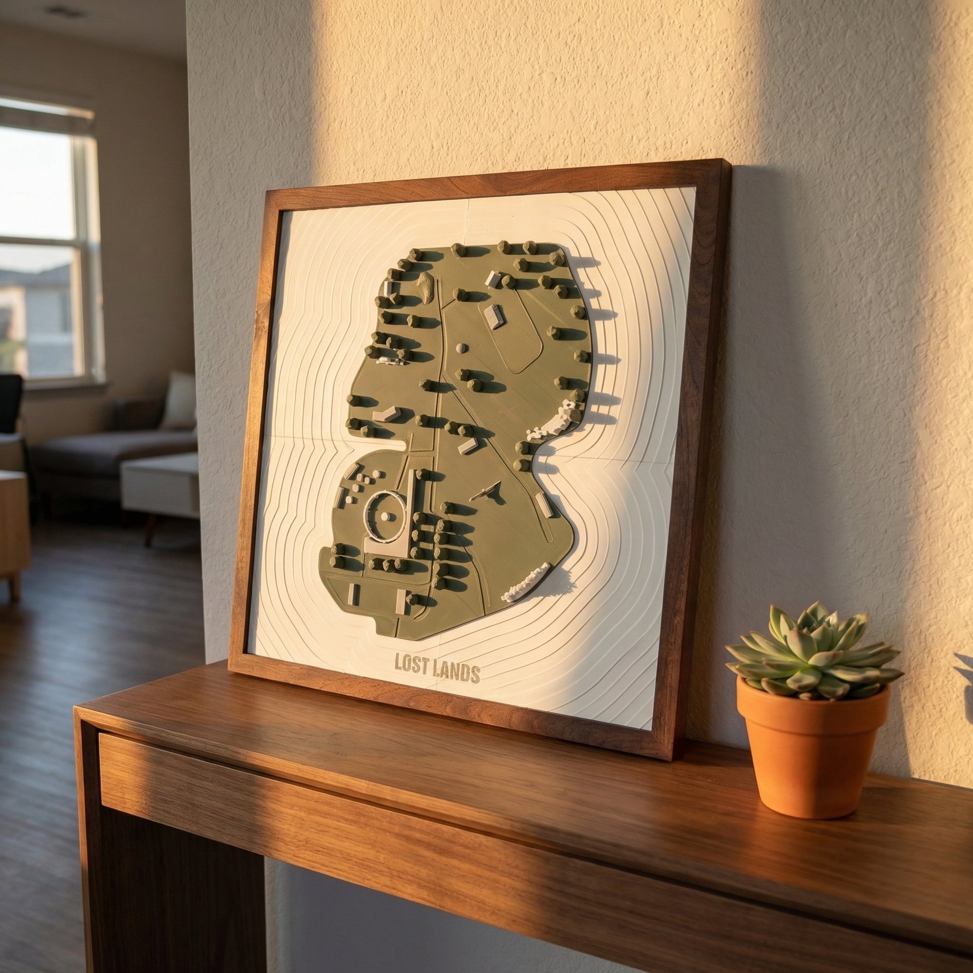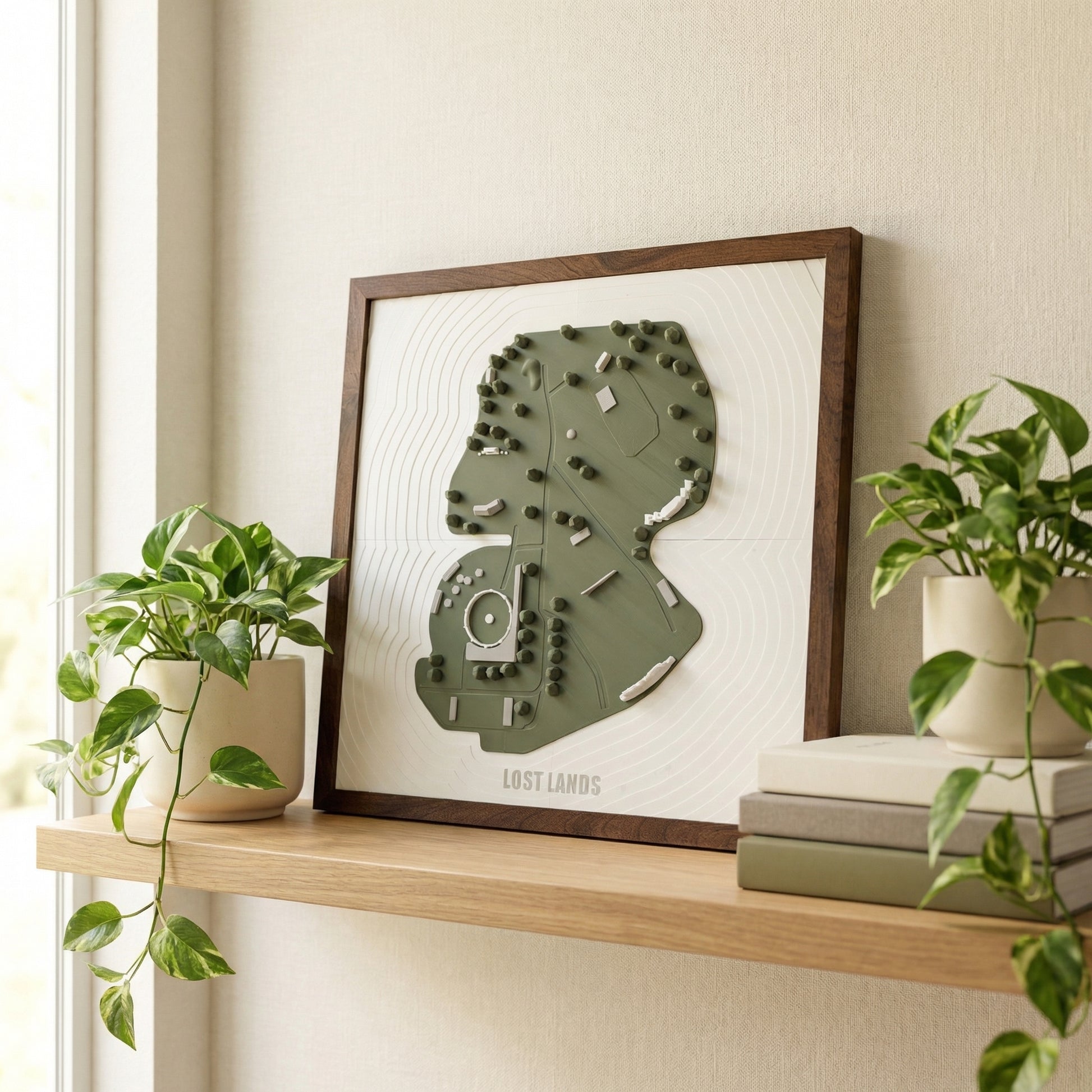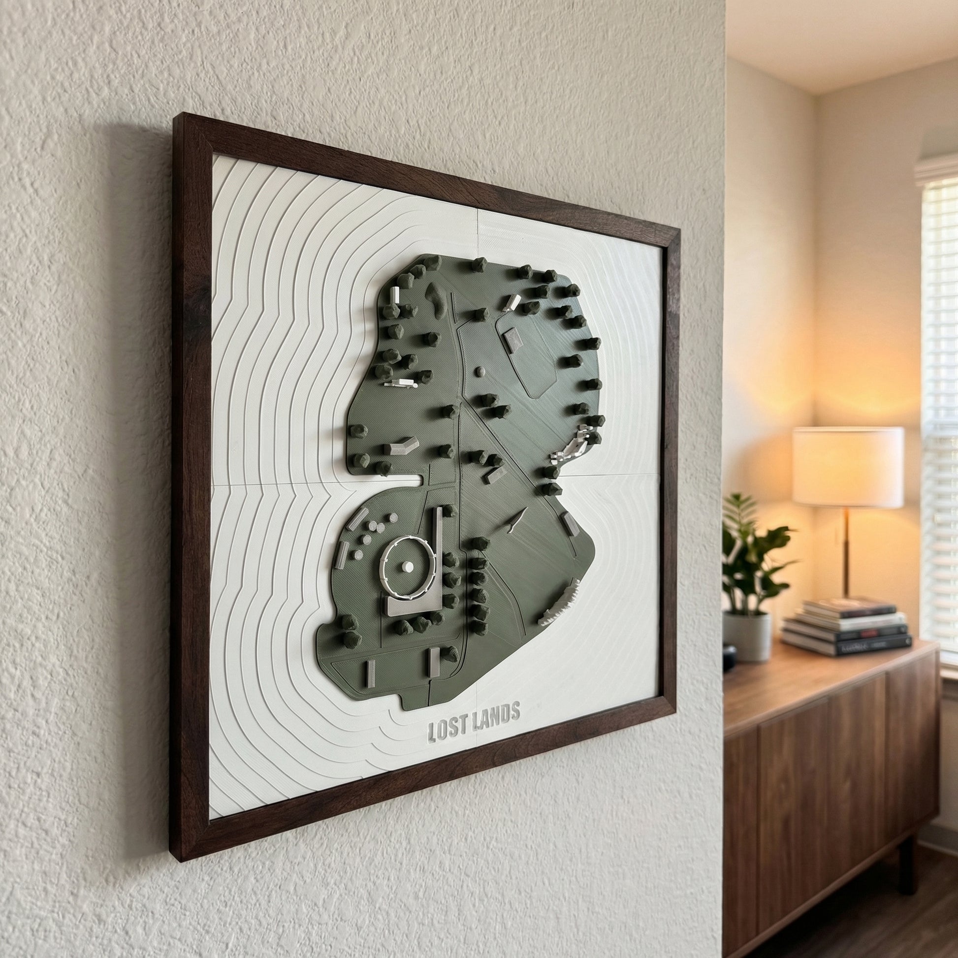 Framed in dark-stained wood and printed with sustainably sourced bioplastic PLA, this artwork is both minimal and bold, making it a perfect centerpiece for any room. Whether it’s a conversation starter in your living room or a nostalgic keepsake above your desk, this piece reminds you why Lost Lands feels like home.