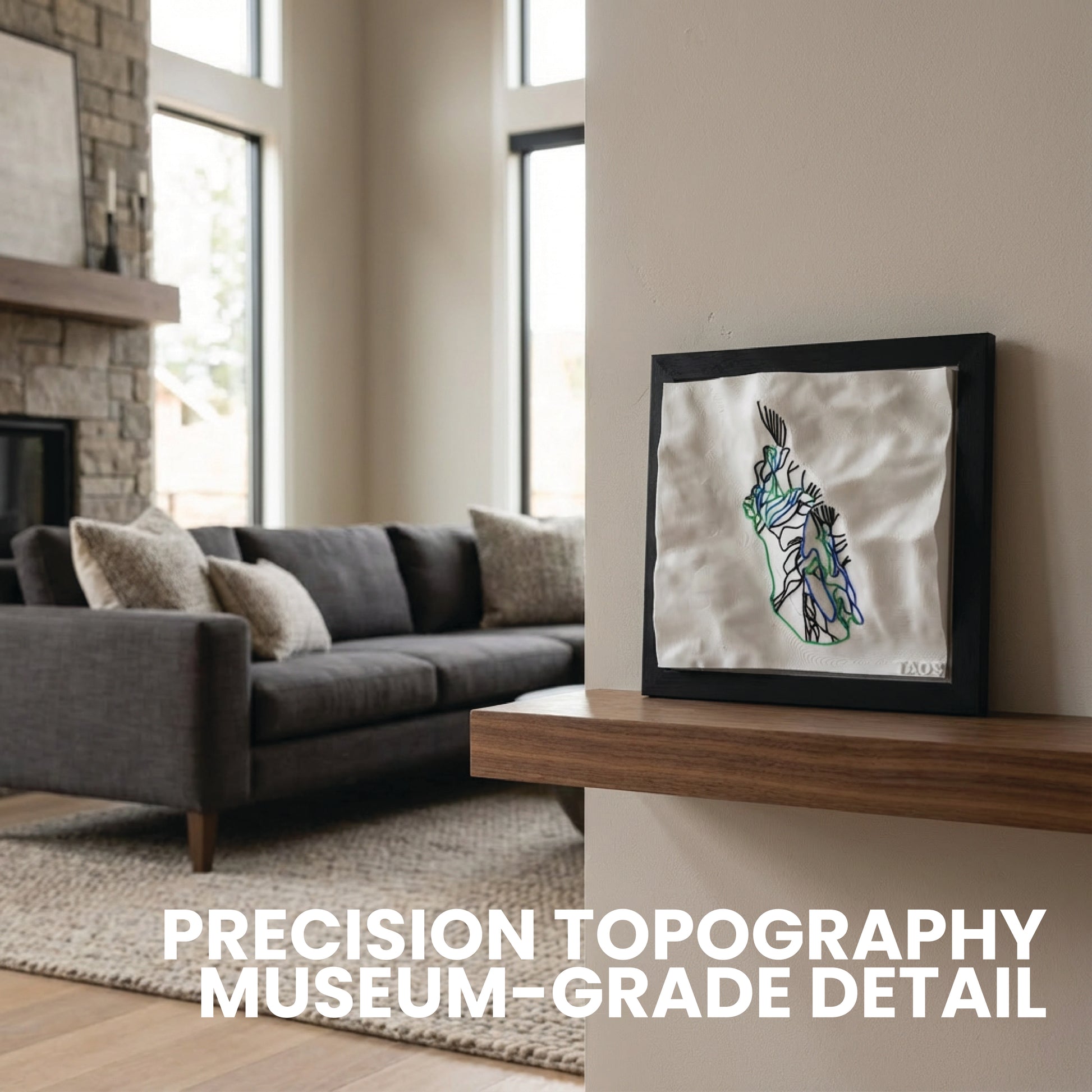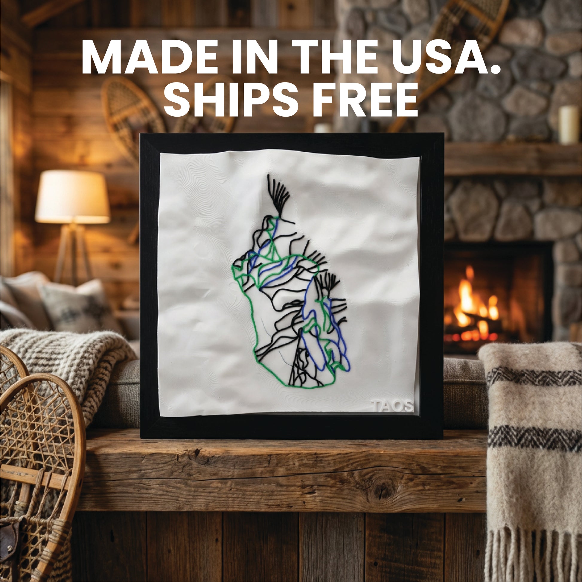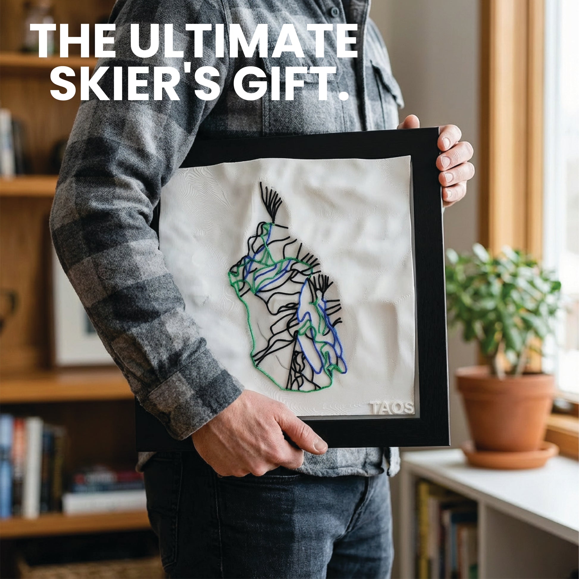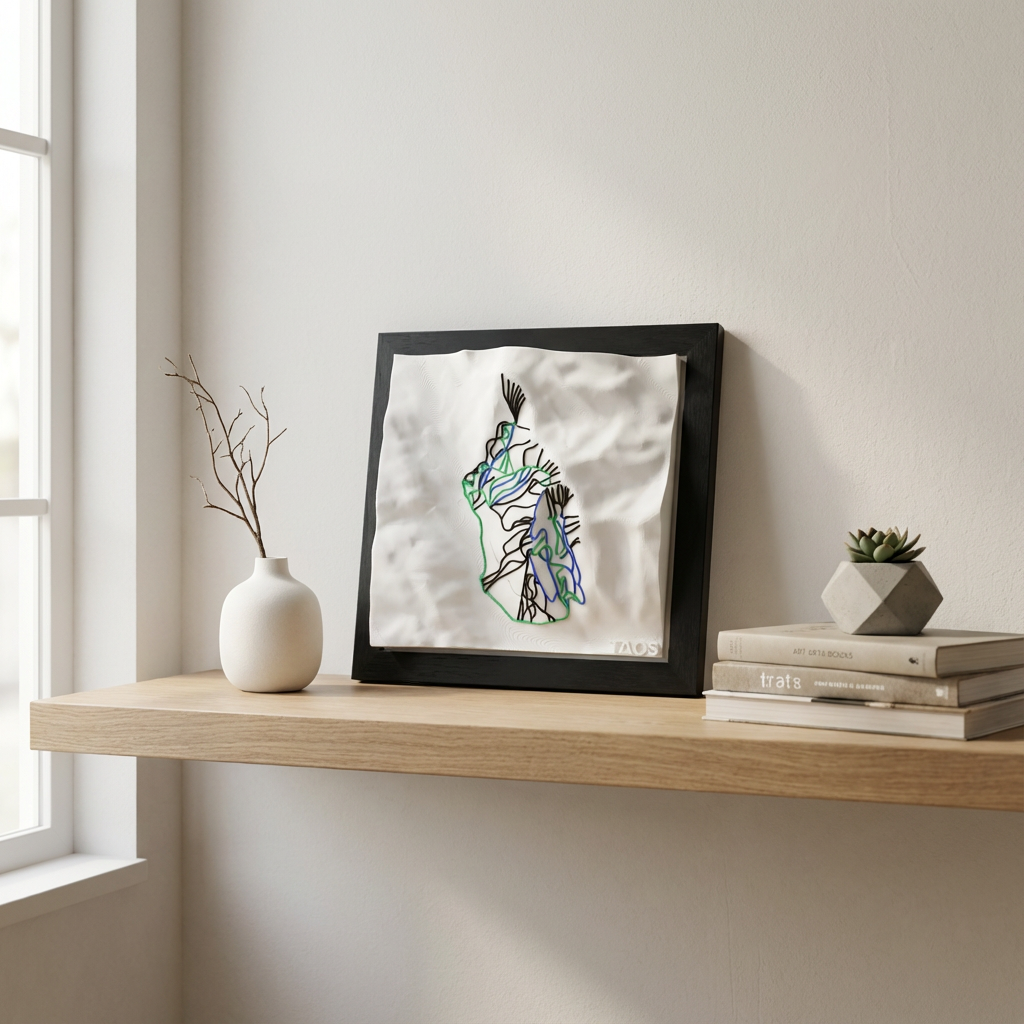 Taos, captured as a true 3D relief you can live with. This framed 9”x9” ski hill map turns real terrain and real runs into a clean, design-forward statement piece that fits modern homes and ski spaces alike.